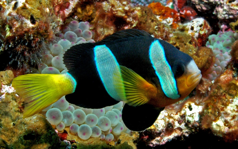 - Клоун кларка, шоколадный амфиприон – рыбка классической формы: овальное вытянутое тело, массивные плавники, спинной как бы разделён на два: посередине лучи короче, чем по краям. Основной цвет тела чёрный с желтоватым отливом, который при определённом освещении приобретает оттенок тёмного шоколада. Плавники и морда жёлтые. Поперёк тела проходят три белые полоски: сразу за глазами, посередине и у хвоста. В условиях аквариума вырастает до 10 см;