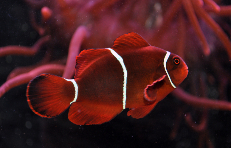 - Мавританский клоун – цвет тела тёмно-бордовый, поперёк проходят три чётких белых полосы: по жабрам, по центру и в районе хвостового плавника. Размеры взрослой рыбы до 14 см. В аквариуме предпочитает жить с анемонами любого вида;