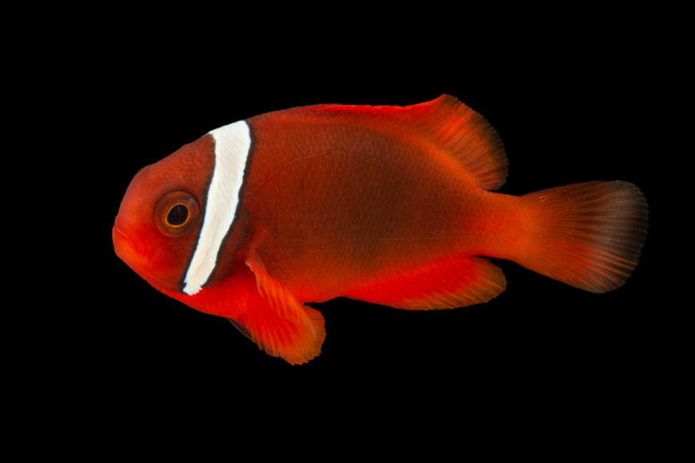 - Клоун томатный (красный) – оранжево-красный фон, по которому в районе жабер проходит белая широкая полоса с тонкой едва заметной чёрной окантовкой. Глаза чёрные. Плавники в цвет тела, спинальный тянется от головы до хвоста. Вырастает рыба до 11 см. В природе живёт среди таких актиний, которых крайне сложно содержать в домашнем аквариуме, поэтому томатных клоунов селят в гроты;