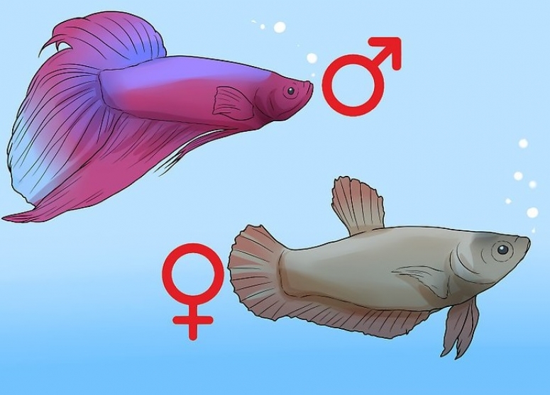 Чтобы отличить самку от самца, можно обратить внимание на наличие белой «крупинки» возле анального отверстия и короткие грудные плавники. Кроме того, при готовности к нересту на теле самки проявляются вертикальные полосы. Рыбка петушок становится половозрелой в возрасте около 3–4 месяцев.