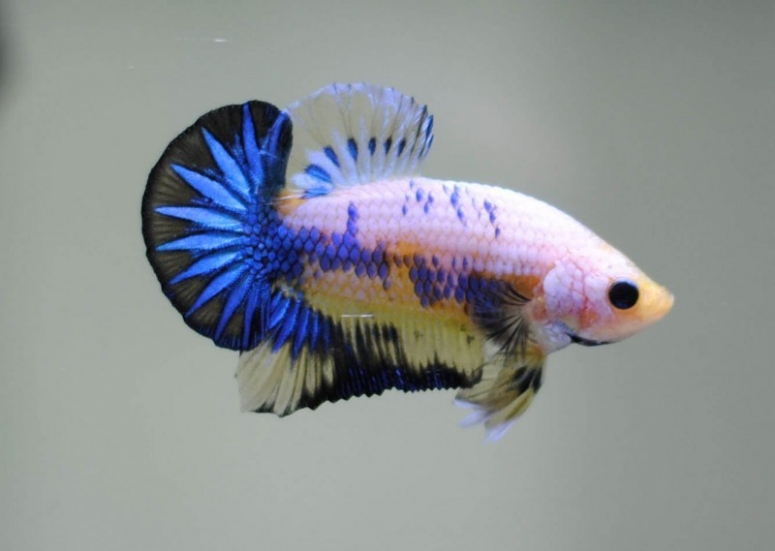 - Полумесяцехвостые петушки: хвост такой рыбки широкий, размашистый, крайние лучи расположены по отношению друг к другу под углом 175-180°. Край хвоста изогнут как полумесяц. Роскошно такая рыба смотрится в двухцветной окраске, так как раскрывается вся прелесть контрастного перехода одного цвета в другой. Другое название рыбки – петушок халф мун. Внутри вида есть подвиды: розахвост, перьехвост и полусолнце. Различаются строением лучей;