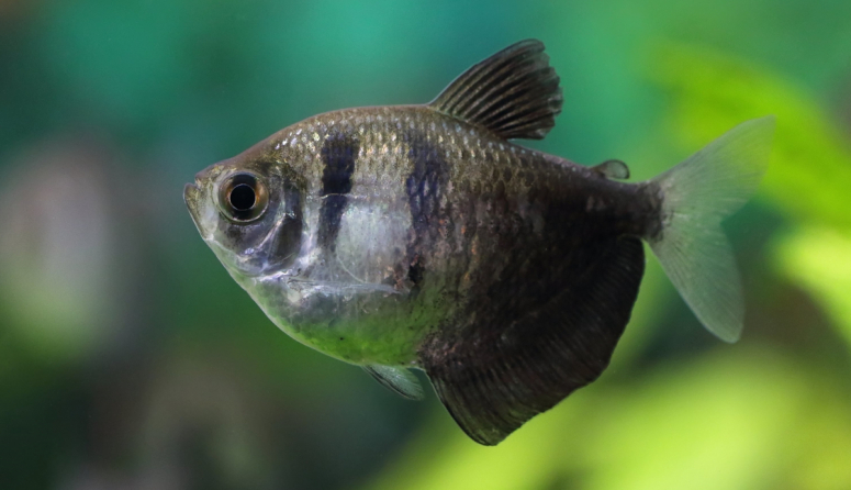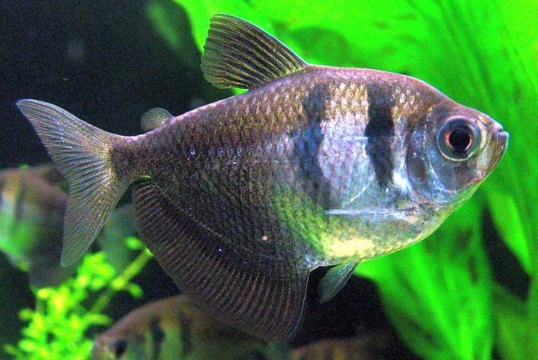 - Классическая, или чёрная тернеция. Окрас рыбы серебристый с бледными чёрными полосами. С возрастом эти полосы становятся ещё менее заметны. Кроме того, тернеция меняет свою яркость при стрессе: напуганная, она бледнеет, а когда успокаивается, то снова обретает привычный насыщенный окрас. Классическая тернеция имеет светло-серебристый хвост, чёрные плавники и чёрную вертикальную полосу на глазу.
