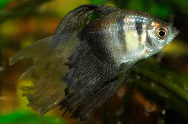 - Вуалевая. Отличается от классической роскошными плавниками, делающими её похожей на петушка или золотую рыбку. Окрас тот же.