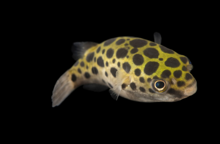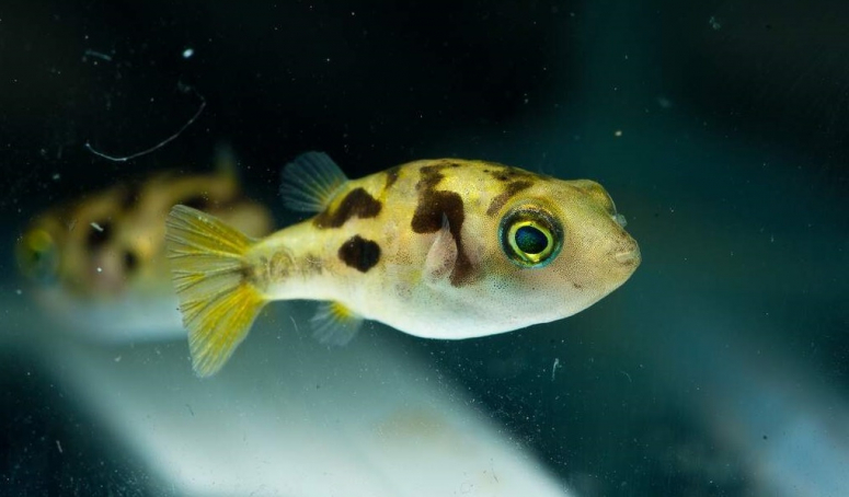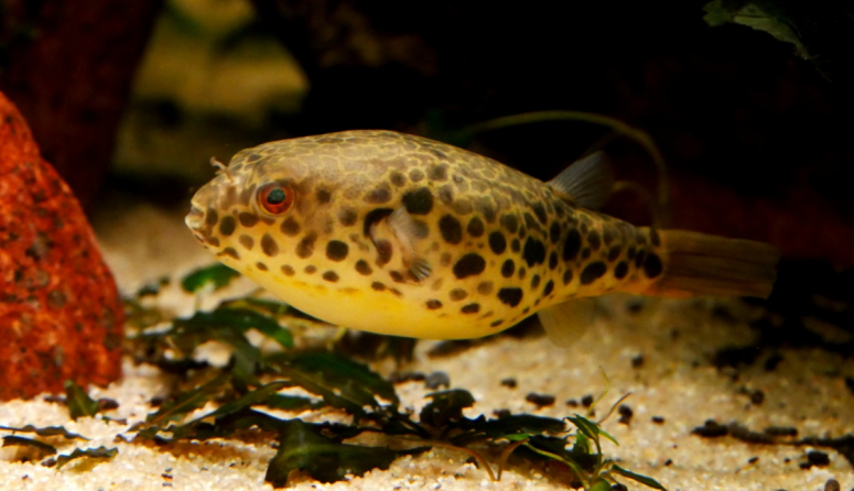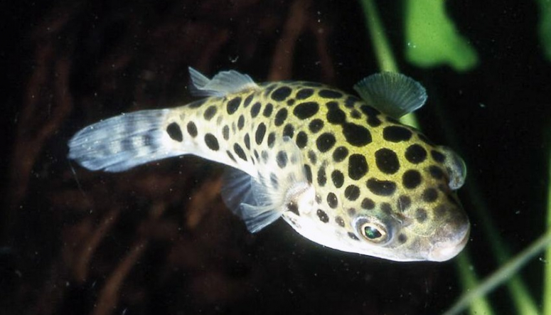 - Тетраодон леопардовый – имеет окраску, схожую с шерстью леопарда: круглые тёмные пятна на светлом жёлтом фоне. Эти рыбы неагрессивны, вырастают до 10 см (самцы чуть меньше), достаточно активны в течение дня. Живут в неволе до 10 лет;