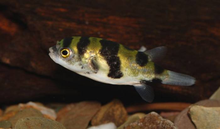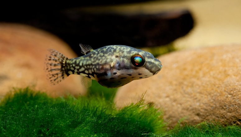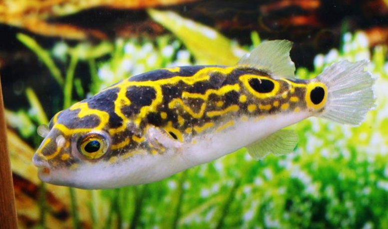 - Карликовый тетрадон – действительно уникальная рыбка: не только умеет становиться шаровидной, но и изменяет окраску в зависимости от условий. Тело рыбы жёлтое, покрыто тёмными пятнами неправильной формы. Взрослые редко вырастают больше 5 см. Из-за малых размеров она неагрессивна по отношению к другим обитателям, хотя и себя в обиду не даст. Любимое занятие карликового тетрадона – охотиться за улитками;