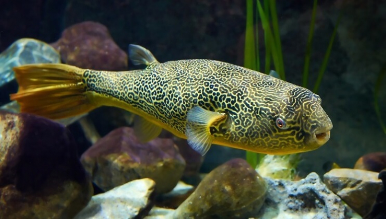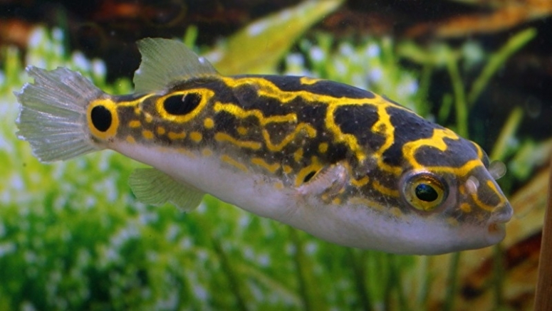 - Тетраодон линеатус – неуживчивая рыба, которую сложно содержать в аквариуме. Чёрно-жёлтые узоры на теле напоминают лабиринт.