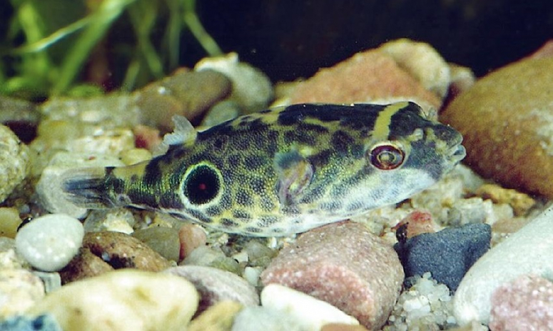 - Тетраодон таиландский – рыба окрашена тёмно-оливковыми оттенками сверху и светлыми снизу. По всему телу – традиционные для иглобрюха тёмные пятна. В районе хвоста – круглое глазчатое пятно с красной сердцевиной. Самки полнее, самцы помельче и насыщеннее окрашены. Злобные рыбы, подходят только для видовых аквариумов;