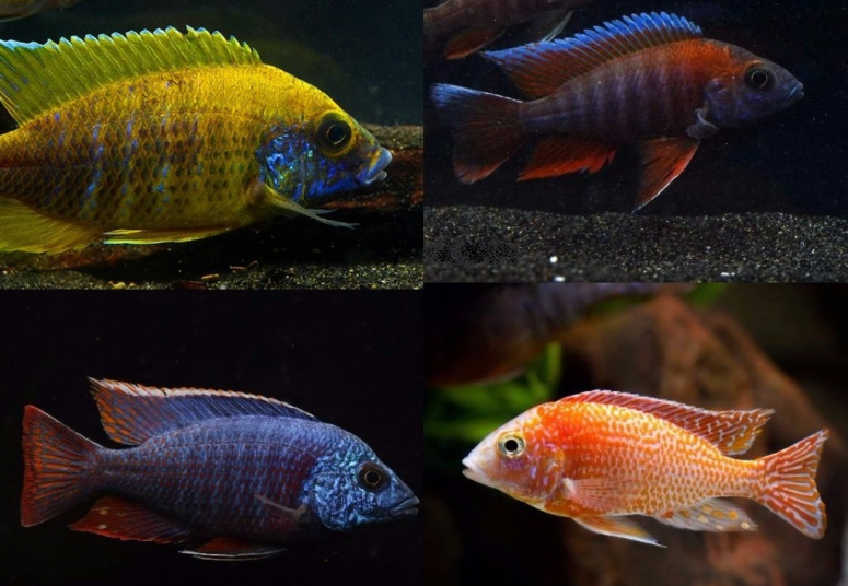 Малавийские цихлиды отличаются выраженными половыми различиями: яркими и красивыми бывают только самцы. Самка всегда блёклая, а по окрасу самца можно понять, к какому виду относится представитель. Описание окрасов каждого вида – непростая задача. Общее для всех видов – наличие множества искрящихся чешуек, поблёскивающих даже при скудном освещении.