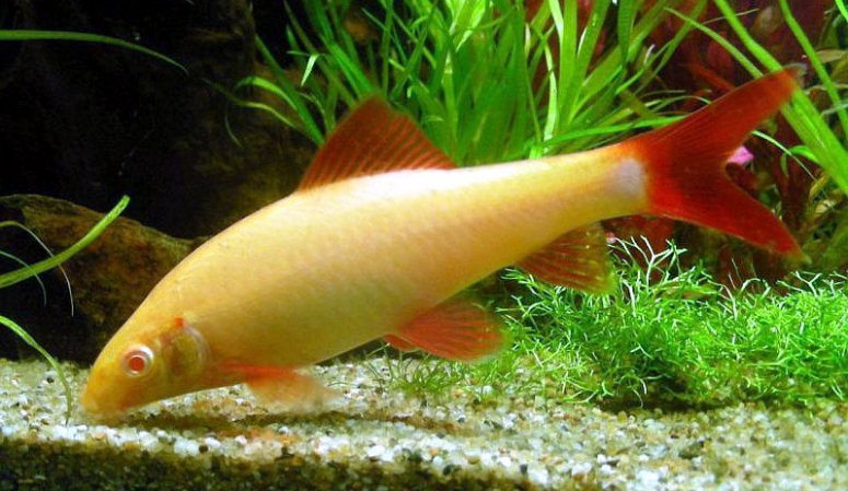 - лабео альбинос – рыбка с двухуцветным окрасом: всё тело бело-жемчужное, хвостовой плавник красный, как и глаза. Из всех лабео они наиболее мирные и спокойные;