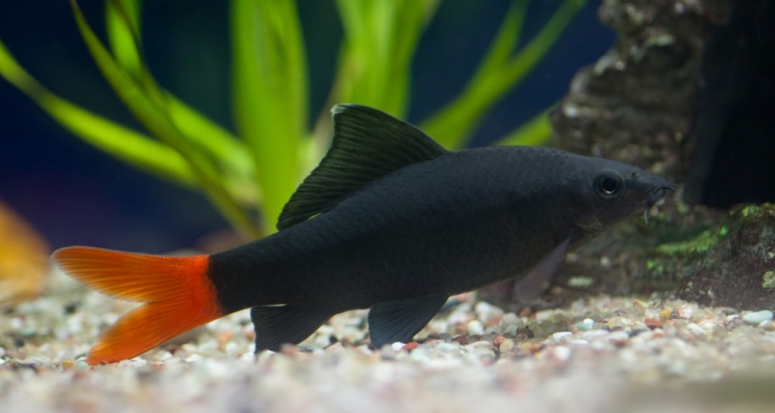 - лабео биколор (двухцветный) – самый известный представитель. Фактурная расцветка сделала рыбку очень популярной. Её тело бархатно-чёрное или тёмно-серое, плавники в цвет тела, кроме хвостового: он ярко-красный. Размеры взрослой рыбки в аквариуме – 12-15 см, в природе они достигают 20 см;