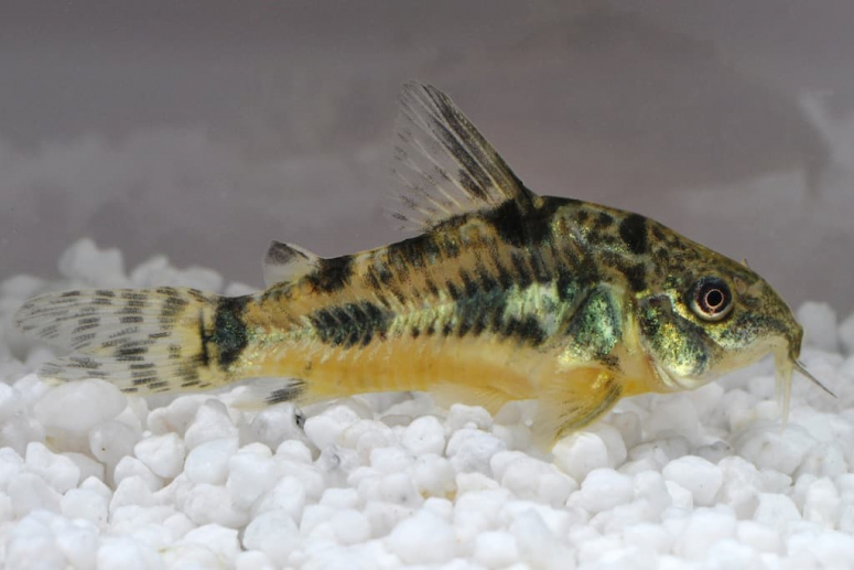- Сомик коридорас (крапчатый). Маленькие неприхотливые рыбы, живущие в основном на дне. Им не нужен дополнительный воздух, так как у них есть «кишечное дыхание», и дышат они не только жабрами. Мирные спокойные и позитивные рыбки, которые станут хорошими соседями другим представителям в аквариуме объёмом от 30 литров.