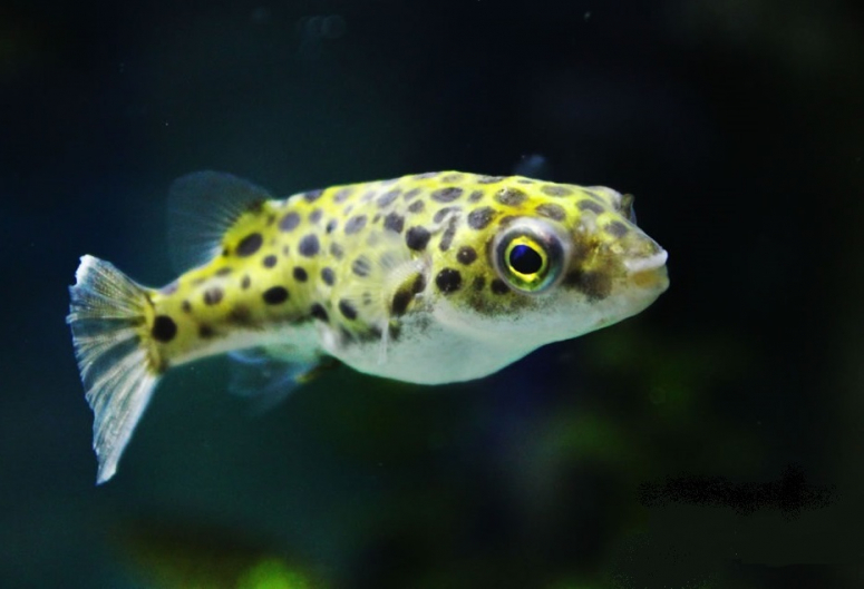 Окрас у рыбки очень необычный и выразительный: фоном тела служит ядовито-желтый, с зеленым отливом, цвет. По площади тельца расположены небольшие темные пятнышки, за что эту рыбку еще называют пятнистым тетрадоном. Брюшко же имеет очень светлый окрас, и под определенным углом кажется совсем белым.
