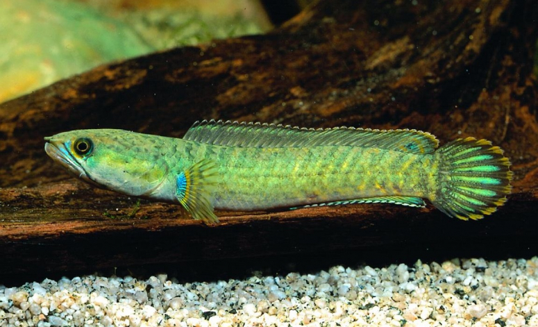 - Карликовый змееголов – наиболее популярный у аквариумистов из-за размеров. Редко вырастает больше 15 см. Относительно уживчивый: не трогает тех, кто крупнее него, а так же сородичей. Можно содержать даже небольшой стаей. Агрессия проявляется в период нереста, поэтому пару, готовую к спариванию, нужно отсаживать в другой аквариум, либо убирать всех остальных жителей;