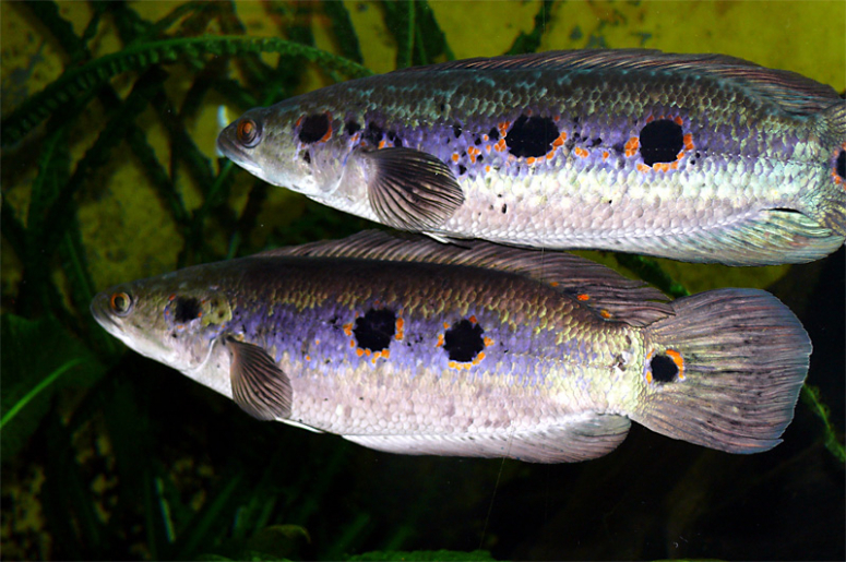 - Глазчатый змееголов – красивый крупный хищник. Тело чуть сдавлено с боков, что делает его похожим на обычных рыб. Основное его наименование — трехточечный змееголов. Название «глазчатый» получил благодаря ряду крупных чёрных пятен в обрамлениях на боку. Основной цвет – серо-серебристый. Размер – 45 см, поэтому рыба содержится только в огромных аквариумах;